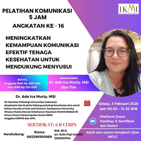 Pelatihan Komunikasi 5 jam diselenggarakan oleh IKMI (Ikatan Konselor Menyusui Indonesia) memiliki beberapa manfaat, terutama bagi konselor menyusui yang ingin mempersiapkan ujian IBCLC (International Board Certified Lactation Consultant). Disamping itu pelatihan ini merupakan syarat ujian IBCLC sekaligus syarat ikut kelas pendampingan menuju ujian IBCLC dari IKMI.